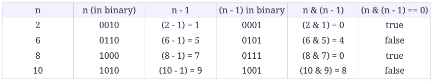 (n & (n - 1)) = 0 => 00000000 00000000 00000000 00000000